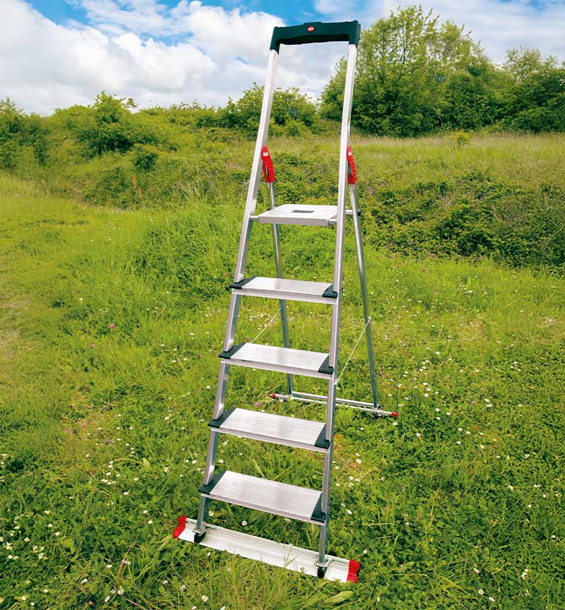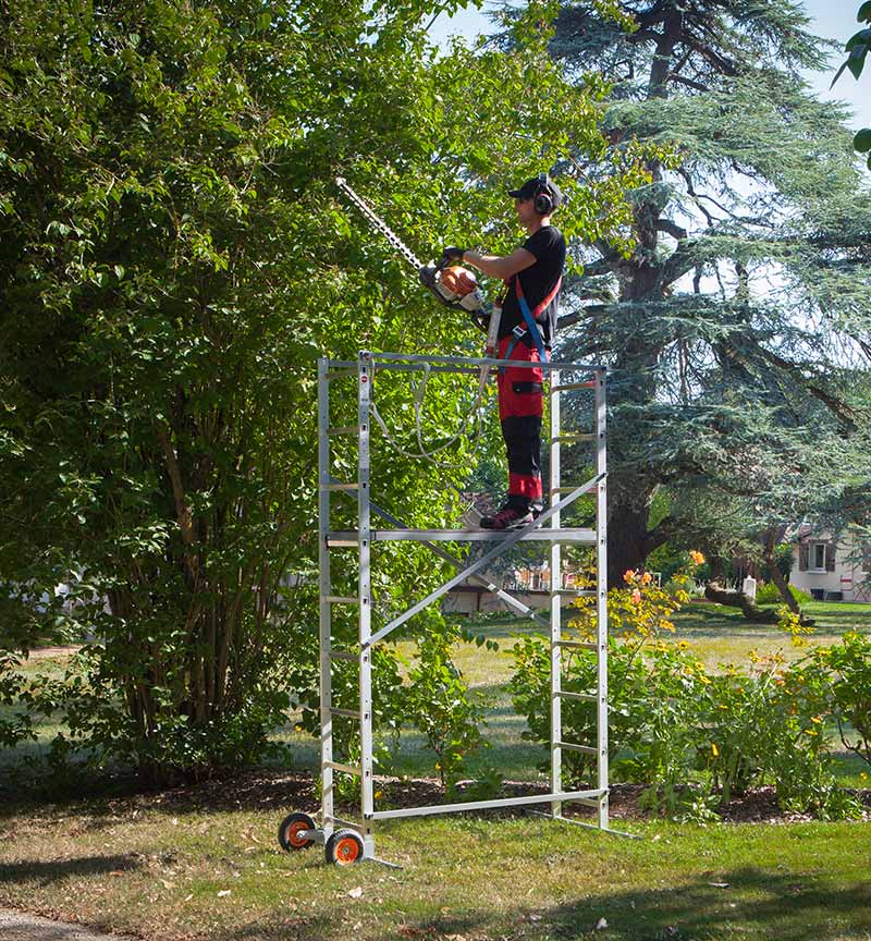 Astuce Hailo : pour atteindre les branches hautes sans effort, optez pour un échafaudage de jardin ou un escabeau avec des rails de jardin. Ces équipements facilitent la taille et sécurisent vos travaux de jardinage.