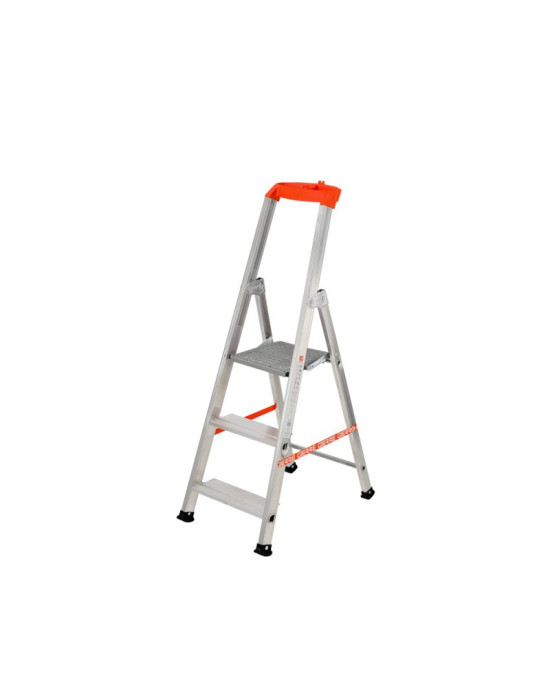 Escabeau professionnel en aluminium 3 marches - Grande tablette porte-outils avec crochet pour un meilleur confort de travail - Plateforme en fonte d'aluminium caillebotis de 26x26 cm avec structure antidérapante - Marches en aluminium serties XXL de 11 cm - Sertissage trapezoïdal - Montants en aluminium - Robuste articulation en acier - Embouts antidérapants fixés aux montants - Câble de sécurité
