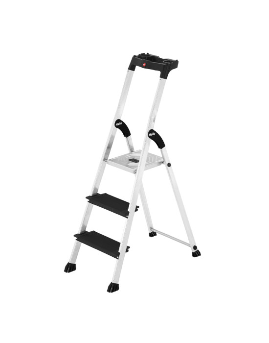 Escabeau professionnel 3 marches Hailo 4XL BlackLine - Plateforme et marches avec striures antidérapantes et retour de matières anti-coupures - Garde-corps avec tablette porte-outils et crochet porte-seau - Embouts antidérapant haute stabilité - Liaison marches/montants à rivetage haute technologie - Encombrement réduit en position repliée - Marches XXL rivetées de 13 cm - Hauteur de la plateforme : 63 cm
