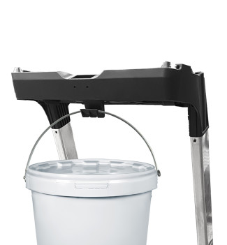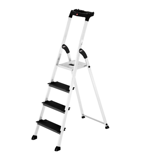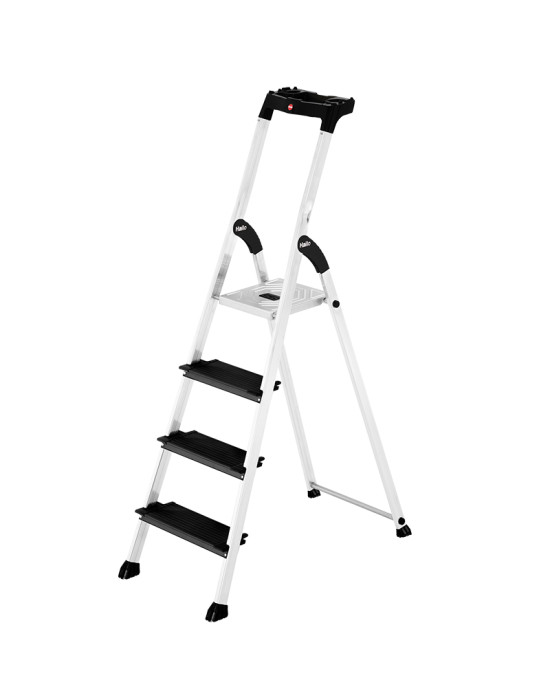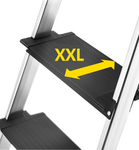 Escabeau professionnel 4 marches Hailo 4XL BlackLine - Plateforme et marches avec striures antidérapantes et retour de matières anti-coupures - Garde-corps avec tablette porte-outils et crochet porte-seau - Embouts antidérapant haute stabilité - Liaison marches/montants à rivetage haute technologie - Encombrement réduit en position repliée - Marches XXL rivetées de 13 cm - Hauteur de la plateforme : 85 cm