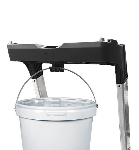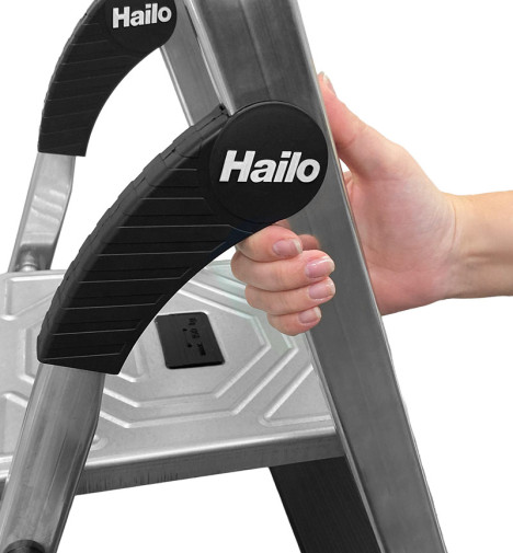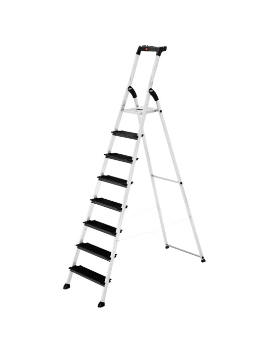 Escabeau professionnel 8 marches Hailo 4XL BlackLine - Plateforme et marches avec striures antidérapantes et retour de matières anti-coupures - Garde-corps avec tablette porte-outils et crochet porte-seau - Embouts antidérapant haute stabilité - Liaison marches/montants à rivetage haute technologie - Encombrement réduit en position repliée - Marches XXL rivetées de 13 cm - Hauteur de la plateforme : 172 cm