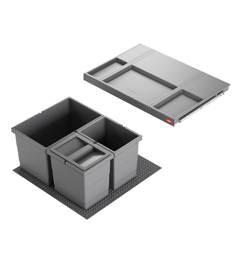 Poubelle de cuisine encastrable Hailo AS Allegro S220 14L + 2x6,5L - Gris anthracite - 1 bac de 14L et 2 bacs de 6,5L amovibles- Couvercle amovible avec rangements supérieurs - Tapis antidérapant et stabilisant pour les bacs - Nettoyage facile - Conçue pour meubles coulissants avec tiroir d'une largeur de 60 cm - Se fixe sur un système existant de tiroir d'une profondeur minimum de 50 cm - Montage rapide