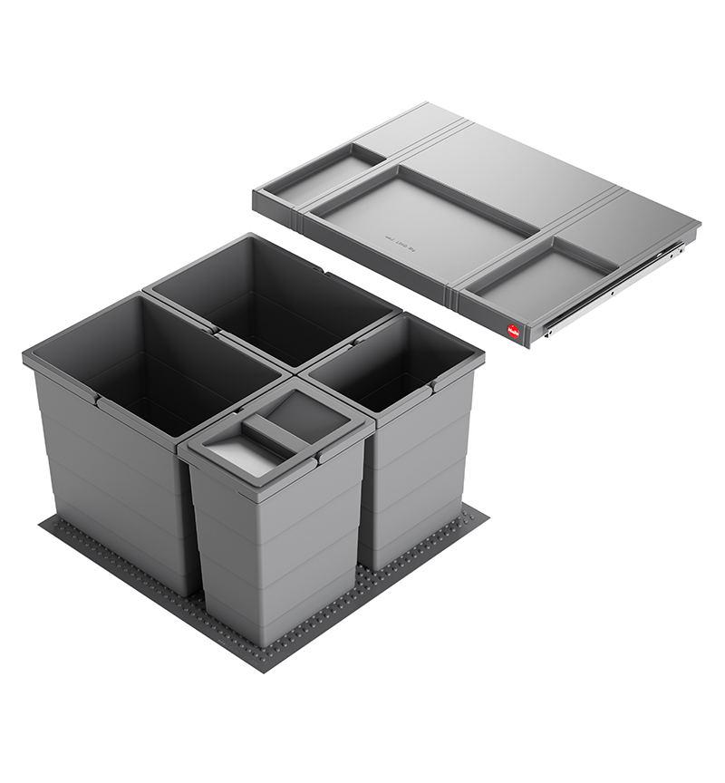 Poubelle de cuisine encastrable Hailo AS Allegro S295 2x18L + 2x8L - Gris anthracite - 2 bacs amovibles de 18L et 2 bacs amovibles de 8L - Couvercle amovible avec rangements supérieurs - Tapis antidérapant et stabilisant pour les bacs - Nettoyage facile - Conçue pour meubles coulissants avec tiroir d'une largeur de 60 cm - Se fixe sur un système existant de tiroir d'une profondeur minimum de 50 cm - Montage rapide