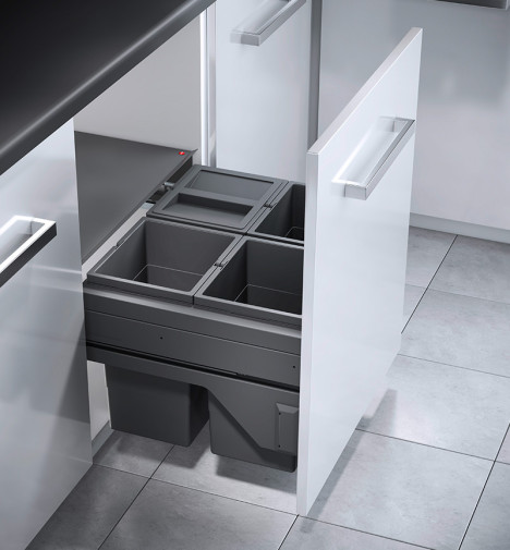 Poubelle de cuisine encastrable Hailo Cargo 52L - Gris anthracite - 4 bacs de 13L dont un avec couvercle - Bacs amovibles en plastique gris - Conçue pour meubles coulissants sans tiroir d'une largeur de 60 cm - Se fixe sur les parois latérales du meuble - Glissières à fermeture ralentie Soft-Close - Gain de place - Tri sélectif plus facile - Montage simple et rapide