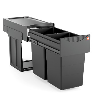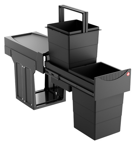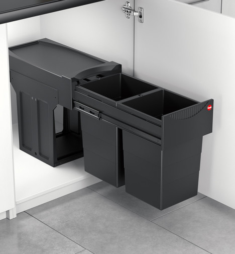 Poubelle de cuisine encastrable Hailo Tandem 30L - Noir - 2 bacs amovibles de 15L - Ouverture de la poubelle à la main - Conçue pour meubles à porte battante d'une largeur minimum de 30 cm - Se fixe sur le sol du meuble - Tri sélectif plus facile - Gain de place - Montage simple et rapide